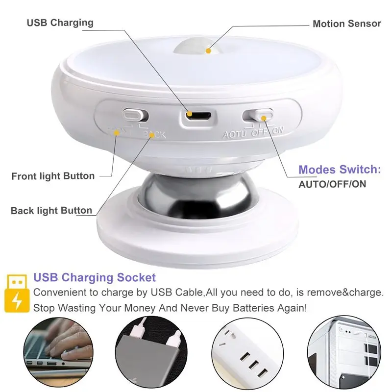 Motion Sensor Night Light Detachable Magnet Base USB Rechargeable LED Human Body Induction 360 Degr